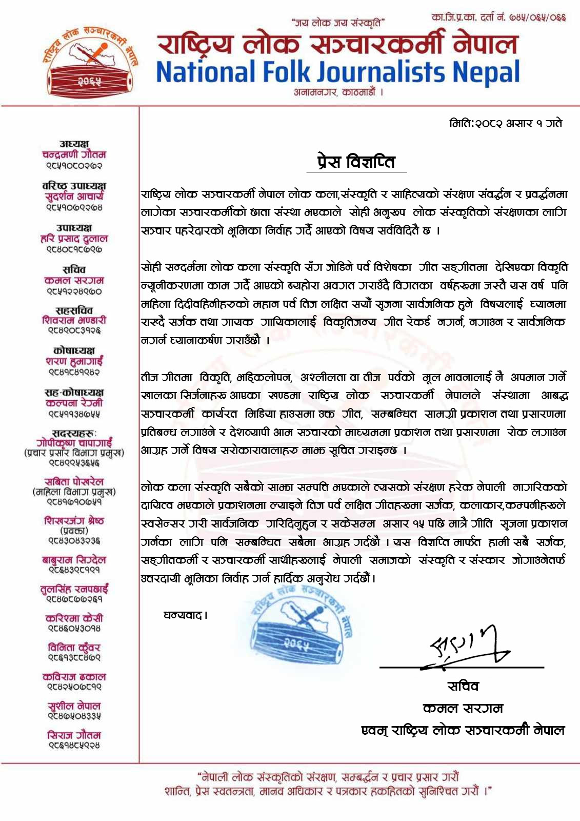अश्लिल र विकृतिजन्य तिज गीत रोक्नको लागि राष्ट्रिय लोक सञ्चारकर्मी नेपालको ध्यानाकर्षण